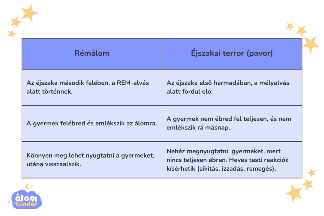 - Rémálom: éjszaka második felében, REM-alvásban; a gyermek ébren van és emlékszik; könnyen megnyugtatható.